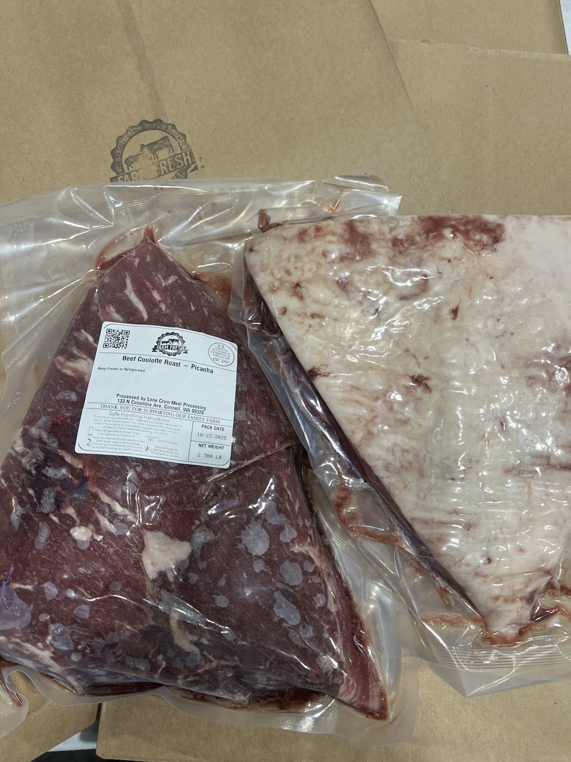 Whole Picanha ready for you to smoke or bbq! The roasts will range from about 2.3 lbs to 2.7 lbs. As with all our beef, these are dry aged for 14+ days, raised on pasture and fed non-gmo feed with no soy, no hormones, & no antibiotics.